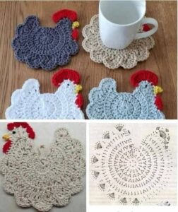 Crocheted chicken coasters can also be designed in themed collections. For example, a farmhouse kitchen theme might include matching chicken coasters, rooster potholders, and egg shaped placemats.